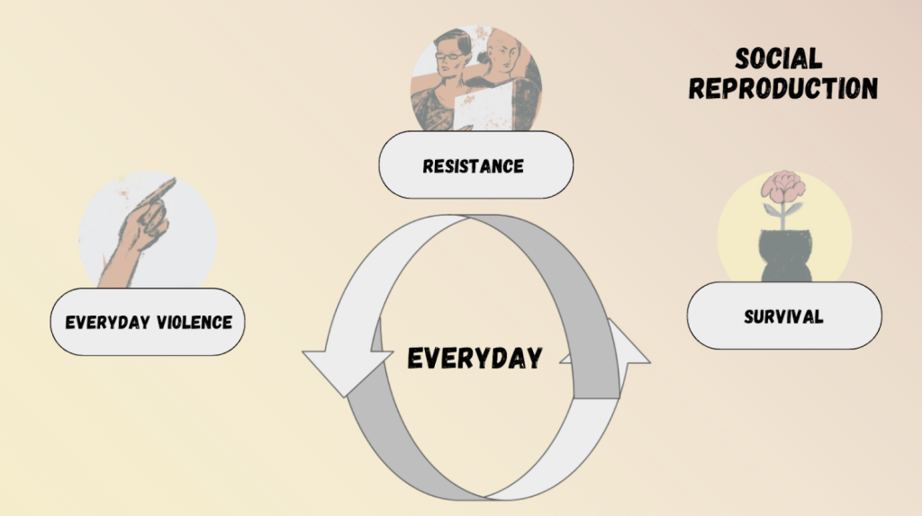 Насильство спричиняє нові способи функціонування, нові розпорядки, ритми, що впорядковують повсякденне життя. Соціальна репродуктивна робота – турбота про інших, про громаду і навіть про довкілля – є центральною для організації та формування повсякденних ритмів.